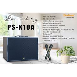 Loa karaoke xách tay Dalton PS-K10A, mẫu loa du lịch cao cấp mang thương hiệu Việt, loa Daton PS-K10A có đầy đủ sức mạnh để đáp ứng cho nhiều nhu cầu: chơi nhạc, karaoke, công việc và những mục đích khác….Loa di động Dalton PS-K10A có vỏ ngoài bằng gỗ, bass 10 inch & 1 treble nên công suất cũng khá mạnh mẽ, bên trong tích hợp sẵn một bình accu 12V, đảm bảo cho loa hoạt động từ 2-4 giờ liền hoặc hơn, 2 mic không dây kèm theo cũng khá nhẹ hơi – có thể dùng cho MC hay hát karaoke qua kết nối không dây với điện thoại/ mày tính bảng.